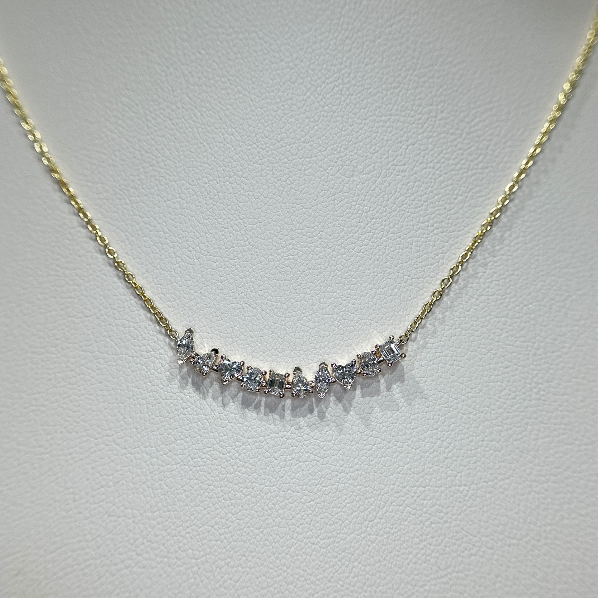 This striking 14K yellow gold necklace features 0.70 total carats of fancy-shaped diamonds, graded G in color and SI1 in clarity. The unique design highlights each diamond’s brilliance, creating a look that is both timeless and distinctive. Perfect for adding a touch of elegance to any outfit or gifting to someone special.